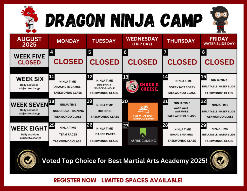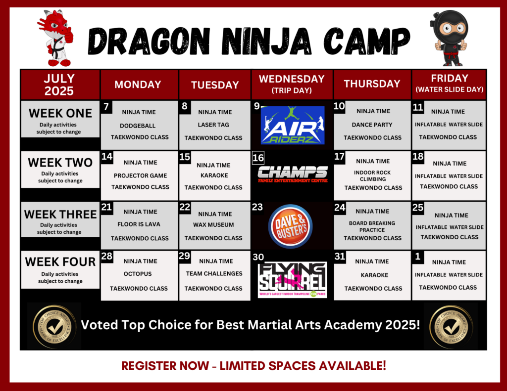 Experience the thrill and excitement of Dragon Taekwondo Ninja Summer Camp! Join us for action-packed days filled with adventure, learning, and fun.